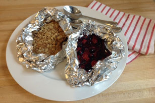 Grill all packets 15 min. Cut slits in foil to release steam; cool packets 15 min. Serve fruit topped with crumbled oat mixture.