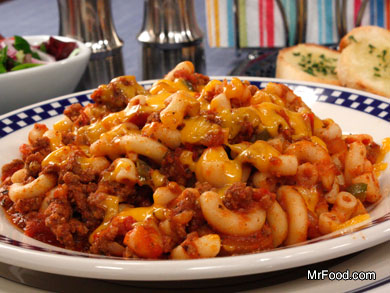 Add macaroni, spaghetti sauce, garlic powder, salt, and black pepper; mix well. Reduce heat to medium-low and let simmer 5 to 7 minutes, or until heated through. Sprinkle with cheese and simmer 1 to 2 minutes, or until cheese is melted; serve.