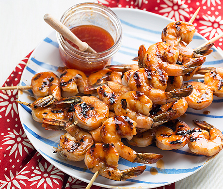 Shrimp can be threaded onto skewers and refrigerated on a tray, loosely covered with plastic wrap, 2 hours before grilling.