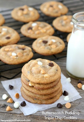 Super soft butterscotch cookies with chocolate chips, white chocolate chips, and butterscotch chips.
