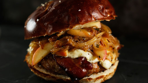 Meanwhile, preheat a large, cast-iron skillet for the burgers. Cook burgers in 1 tablespoon of oil, a turn of the pan, for about 12 minutes turning once. Top patties with blue cheese and cover with foil or a burger lid to melt the cheese. Top burgers with 2 slices of bacon, some apples and onions, set bun tops in place and serve.