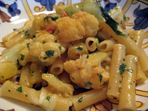 Heat oil in a large pan and add garlic. Cook until light brown then add anchovies. Once anchovies disolve, add tomato, pine nuts, rasins, and the saffron "tea." Cook briefly, stirring. Add cauliflower and season to taste. Lower heat and cook to fully soften cauliflower while the ziti cooks.