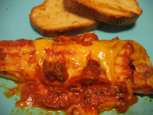 Combine remaining sauce with cooked hamburger and put over manicotti noodles. Top with cheese to desired amount. Cook for 20-30 minutes until sauce is bubbly and cheese is NOTE: I usually make this with...CHEDDAR CHEESE. I know, not your typical manicotti, but I got this recipe when I wasn't great at cooking and used what I had on hand. Turned out to be delicious. Wouldn't serve it any. other. way.