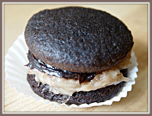 The whoopie pie recipes just keep getting better. I discovered this one at Bon Appétit. In addition to the German Chocolate Filling, their test kitchen added a layer of Chocolate Ganache for a more intense chocolate flavor. This is one of the most delicious whoopie pies ever!