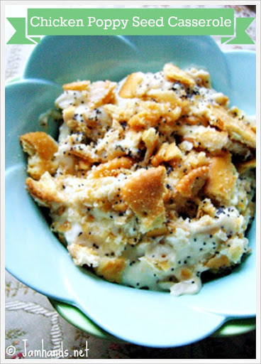 2. In a 8" x 8" baking dish, place the chicken pieces along the bottom. In a separate small bowl, mix together the sour cream, cream of celery and the cream of chicken. Spread the mixture over the chicken in the baking dish. Season with salt and pepper. Top with the crushed Ritz crackers. Sprinkle poppy seeds over the casserole, lightly. Pour the melted butter over the top of the casserole.
