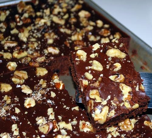 While cake is baking, make icing. Melt butter in saucepan, add cocoa. Turn off heat and add the milk, vanilla and sugar. Add pecans, stir together, and pour over warm cake.