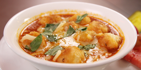 6. Plating: Ladle the soup into 4 bowls and top with 4-5 pizza balls. Sprinkle shredded mozzarella over the soup and garnish with basil.
