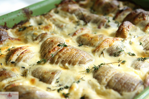 3. Squeeze the shallots in between the layers of potatoes with little bits of fresh thyme. Generously salt and pepper the potatoes.
