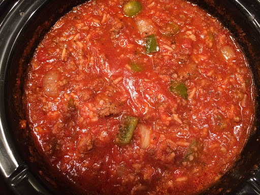 Add Beef Broth, Peppers, Diced Tomatoes and Tomato Sauce.