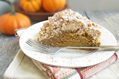 To assemble the cake, pour the cake layer batter into a greased 9″ round springform pan (you can also bake this in a 9″ square baking dish). Crumble the crumb topping evenly over the batter and bake in the preheated oven for approximately 45-50 minutes or until a cake tester comes out clean. Allow to cool completely before removing from the springform pan.