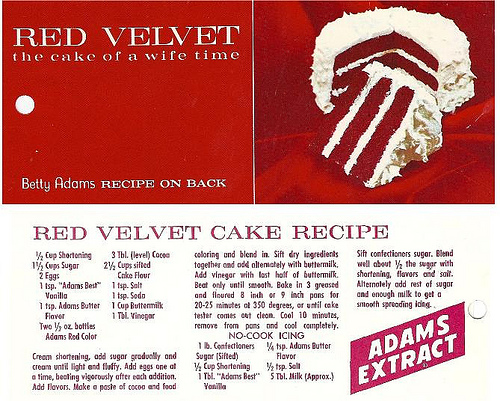 Cream shortening and sugar. Add eggs one at a time and beat vigorously. Add flavors to mixture. In a separate bowl make a paste of cocoa and food coloring and blend into shortening mixture. Sift together dry ingredients and add alternately with buttermilk to mixture. Add vinegar to mixture with last part of buttermilk. Blend well. Bake in 3-9" or 10" pans for 20-25 minutes at 350 degrees. Let cool completely. Cover with frosting.