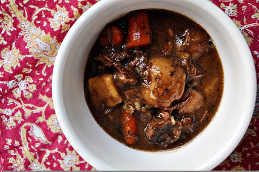 Add the remaining tablespoon of oil to the same skillet & add in the onions. Cook until softened & beginning to brown, about 5 minutes. Add in the chicken broth, 1 1/2 cups Guinness, light brown sugar, thyme, chocolate & bay leaves. Bring to a boil & using a wooden spoon, scrape up any brown bits from the bottom of the skillet. Transfer to the slow cooker.