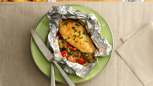 Cut 4 (10x12-inch) sheets of Heavy Duty Foil. Spray center of one side of each with cooking spray. Spoon one-fourth of the rice mixture on center of each sheet. Top each with 1 chicken breast.