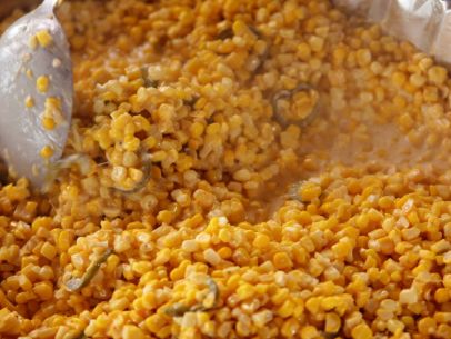 Scrape the corn off the cobs with a knife into a large foil roasting pan. Add the cream, butter, paprika, salt, pepper, garlic and sliced jalapenos, and mix it all together.