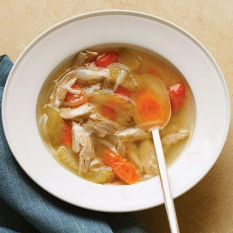Bring the chicken stock to a simmer in a large pot and add the celery, carrots, and noodles. Simmer uncovered for about 10 minutes, until the noodles are cooked. Add the cooked chicken meat and parsley and heat through.