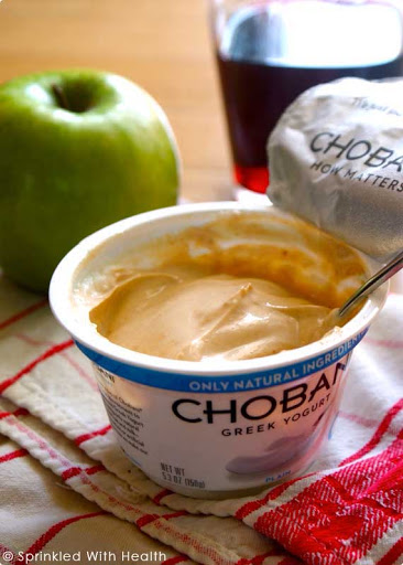 Mix a couple spoonfuls of natural peanut butter and some natural sweetener into a 6 once container of plain greek yogurt.