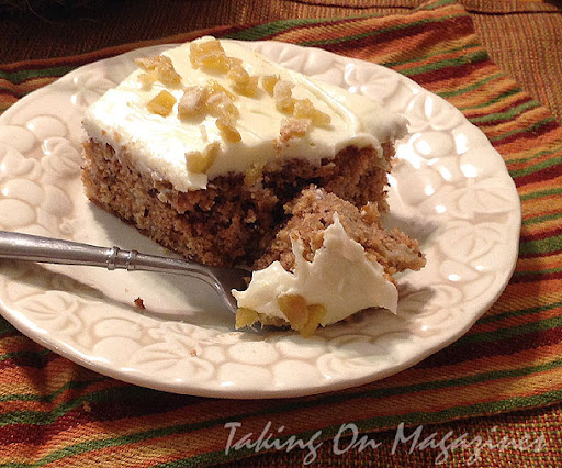 1. Make cake: Preheat oven to 350°F. Mist a 9-by-13-inch baking pan with cooking spray. Spread nuts in a single layer on a baking sheet; bake until lightly toasted, 5 to 7 minutes, stirring halfway through. In a bowl, mix flour, baking soda, cinnamon, ginger and salt.