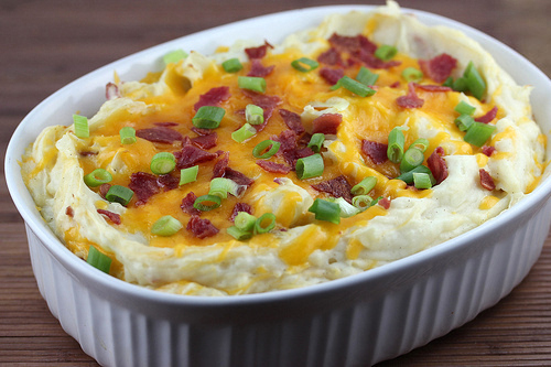 Pre-heat the oven to 350 degrees. Grease a 2 ½-3 quart casserole dish. Return potatoes to the saucepan. Add evaporated milk, sour cream, salt and pepper. Beat with a hand held mixer until smooth. Stir in 1 ½ cups of cheddar cheese and half of the bacon. Spoon the potato mixture into prepared casserole dish.