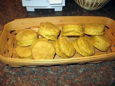 4. Turn dough out onto a lightly floured surface; knead lightly 4 times. Roll dough into a (1/2-inch-thick) 9 x 5–inch rectangle; dust top of dough with flour. Fold dough crosswise into thirds (as if folding a piece of paper to fit into an envelope). Reroll dough into a (1/2-inch-thick) 9 x 5–inch rectangle; dust top of dough with flour. Fold dough crosswise into thirds; gently roll or pat to a 3/4-inch thickness. Cut dough with a 1 3/4-inch biscuit cutter to form 14 dough rounds. Place dough rounds, 1 inch apart, on a baking sheet lined with parchment paper. Bake at 400° for 14 minutes or until golden. Remove from pan; cool 2 minutes on wire racks. Serve warm.