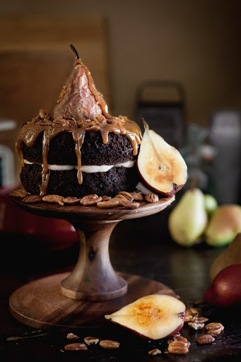 For a caramel drizzled top - Place a whole baked pear on top of the cake, in the center. Sprinkle pecans around the pear. Spoon the caramel over the pear and pecans, letting it pool and drizzle down the sides of the cake.