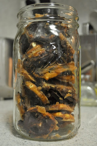 By this time the pretzel-caramel mixture should be done and out of the oven. Pour the chocolate over the pretzel-caramel mixture evenly, again careful to strafe chocolate back and forth down the length of the sheet.