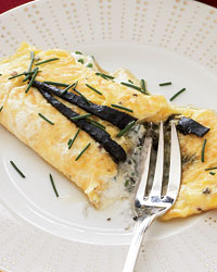 In a superlative combination of fish eggs and chicken eggs, Jacques Pépin stuffs a classic French omelet with sour cream, chives and diced pressed caviar. For an extra indulgence, he also drapes the omelet with long, thin strips of pressed caviar.