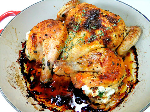 Rub the outside of your chicken with olive oil and fresh herbs and roast in a 375 degree oven until internal temperature reaches 180, about 1 hour 15 minutes
