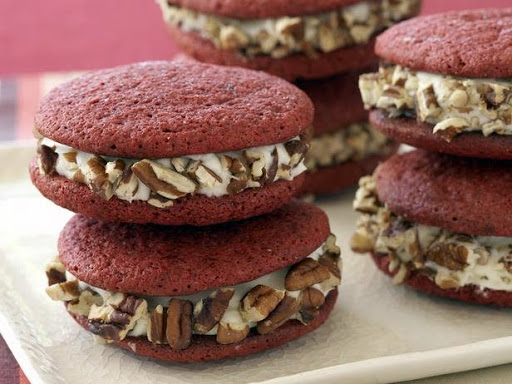 Spread the cream cheese frosting between 2 cooled cookies and roll the edges in finely chopped pecans, if desired.