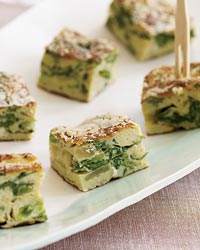 Transfer the skillet to the oven and bake for about 8 minutes, until the center of the frittata is set. Slide the frittata onto a cutting board. Cut into 1 1/2-inch squares and serve hot, warm or at room temperature.