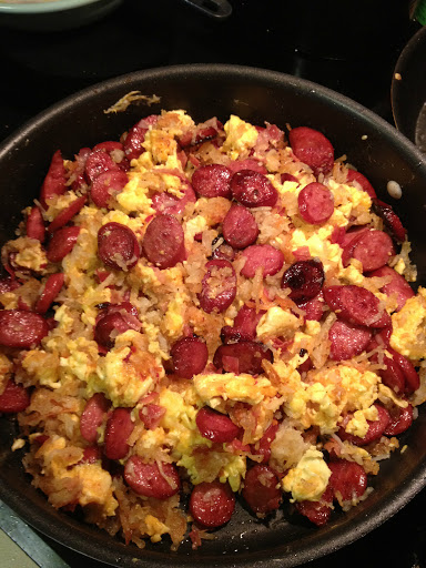 Now I have to admit, I've never fixed this for breakfast. I cook many of the elements separately, keep them warm in a turned off warm oven, and mix them all together just before serving.
