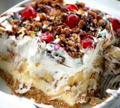 In a medium bowl, cream together the other stick of softened butter, eggs and confectioners' sugar; beat for 15 minutes. Spread evenly on the graham cracker crust. Layer banana slices evenly on top of butter/sugar mixture; layer pineapple on top of the bananas. Evenly spread the Cool-Whip and garnish with cherries and pecans. Drizzle optional chocolate syrup over the top. Refrigerate at least 2 hours or overnight. Keeps well refrigerated for about a week.