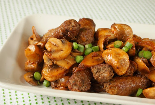 Bring a large pan over high heat. Add oil and onion, saute a few minutes. Cut sausage links into 4 even pieces about 2 inches long. Add to pan and let brown, stirring with a spoon as needed, not too often you want it to brown. After about 8 minutes add mushrooms and garlic and saute until mushrooms begin to brown. Then add salt and pepper to taste and ketchup, just a little bit brings the whole thing together.