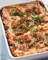 Cover the lasagna with foil and bake for about 40 minutes, until heated through. Uncover and preheat the broiler. Broil the lasagna about 4 inches from the heat until golden brown and crisp on top, about 2 minutes. Let the lasagna rest for 15 minutes. Garnish with parsley leaves, cut into squares and serve.