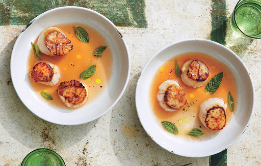 Seared scallops make an easy and impressive dinner, served with the juice from fresh tomatoes, lime and mint.