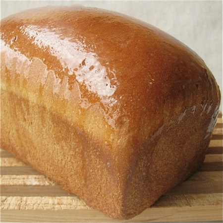 5) Remove the bread from the oven, and turn it out of the pan onto a rack to cool. If desired, rub the crust with a stick of butter; this will yield a soft, flavorful crust. Cool completely before slicing. Store the bread in a plastic bag at room temperature. Yield: 1 loaf.