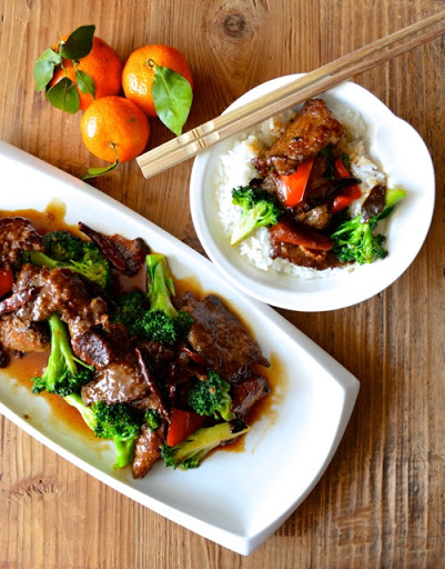 Vuelva a calentar el wok a fuego medio y agregar otra cucharada de aceite, los chiles picantes secos, cáscaras de naranja y el anís estrellado. Permita que los compuestos aromáticos se integren al aceite por un minuto y añadir los pimientos rojos y el ajo picados. Rápidamente, vierta en la mezcla de caldo de carne y permita que llegue a hervir. Poco a poco agregue la lechada de fécula de maíz hasta que la salsa sea lo suficientemente gruesa para cubrir una cuchara.