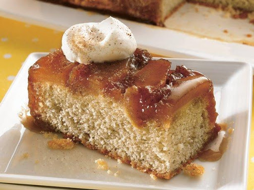 5 Run knife around sides of pan to loosen cake. Place heatproof serving plate upside down over pan; turn plate and pan over. Remove pan. Serve warm cake with whipped cream. Store cake loosely covered.