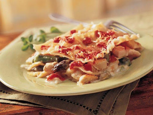 4 Spread about 1/2 cup chicken mixture in baking dish. Top with 3 noodles, 1 1/2 cups chicken mixture, half of asparagus and 1 cup mozzarella cheese. Repeat layers, starting with noodles. Top with remaining 3 noodles.