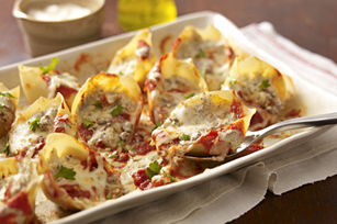 DRAIN shells; stuff with meat mixture. Spread 1 cup sauce onto bottom of 13x9-inch baking dish; top with shells and remaining sauce. Cover.