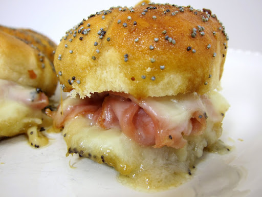 Split each dinner roll. Make a sandwich of the ham and cheese and the dinner rolls. Arrange the sandwiches in a 9x13 pan.