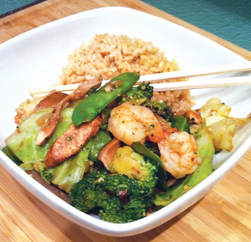 Per Serving: (1 cup brown rice, 10 shrimp and ¼ veggie mixture)