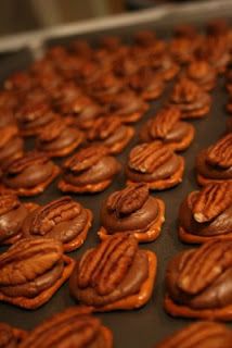 1. Put the pretzels on a baking sheet, you can line with parchment if you want, but I don't find it necessary usually. The key here is to put them pretty evenly spaced in rows, it will make the pecan step MUCH easier. You can use the circle pretzels, or the small twisty ones, but I prefer the snaps, it gives an even surface to place the rest of the stuff.