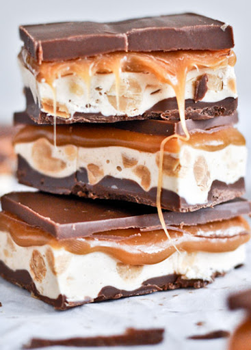 Combine caramel and whipping cream in a saucepan over low heat. Let melt, stirring occasionally, until smooth – this took about 10 minutes for me. Pour over nougat layer and let cool completely.
