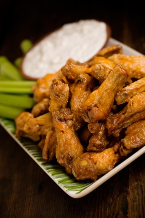In a separate bowl, melt the butter, add the hot sauce and heat thoroughly. Immediately toss hot wings into sauce.