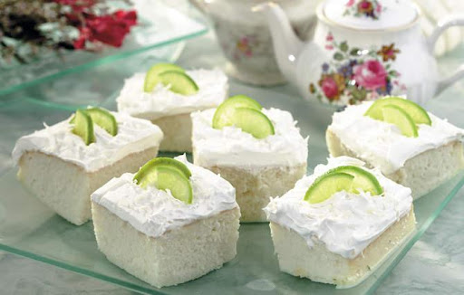 Chill, covered, for 1 hour. Spread whipped cream on top of the cake. Sprinkle with coconut. Garnish with lime slices, if desired. Refrigerate any remaining cake.