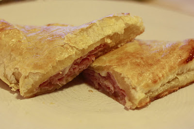With a corner of 1 pastry facing you, place 2 slices ham and 1 slice cheese on the bottom half of the pastry. Fold the pastry over the filling to form a triangle and press the edges to seal. Crimp the edges with a fork. Repeat with the remaining pastry. Brush the top of the pastries with the egg mixture. Place the pastries onto a baking sheet.