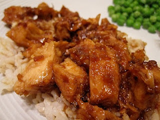 Season both sides of chicken with salt and pepper, put into crock pot. In a small bowl, combine honey, soy sauce, onion, ketchup, oil, garlic and pepper flakes. Pour over chicken. Cook on low for 3 hours or on high 1 1/2 hours. Chicken into bite size pieces, then return to pot and toss with sauce. Serve over rice or noodles.