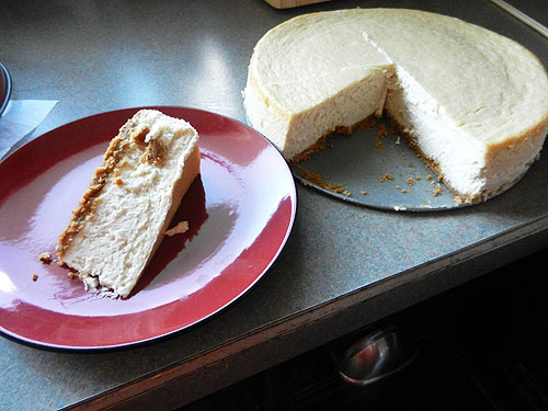 9. Bake the cheesecake in preheated oven for 1 hour. After an hour, turn the oven off and forget the cake. Do not take it out of the oven. At this point the cheesecake will still be jiggly in the middle. That is okay. Let cake cool in the oven with the door closed for 5 to 6 hours; this will help prevent cracking. Chill in refrigerator until serving.