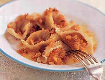 These stuffed dessert dumplings with a chewy noodle-dough wrapping are a Ukrainian specialty. The fruit fillings vary widely—ours are stuffed with dried apricots and walnuts, then sprinkled with a cinnamon-crumb topping