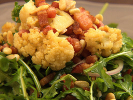 When ready to serve, mix the arugula salad with the cauliflower and garnish with pine nuts.